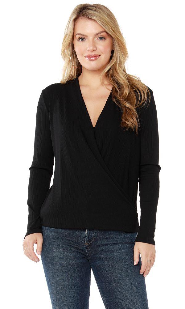 This long sleeve slub knit top features a wrap front for a truly flattering fit. Easy enough to lounge around the house in, chic enough to wear out in the city.