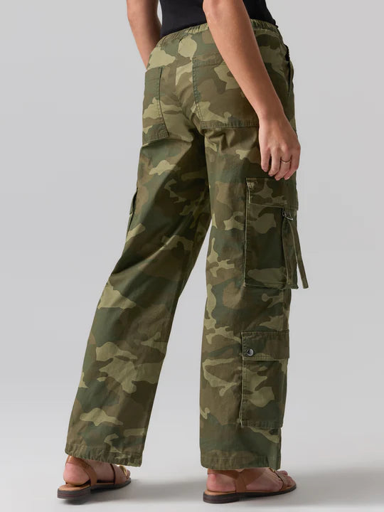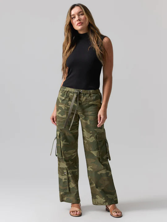 A semi-high rise, lightweight wide-leg cargo pant equipped with adjustable pull tabs on the pockets.