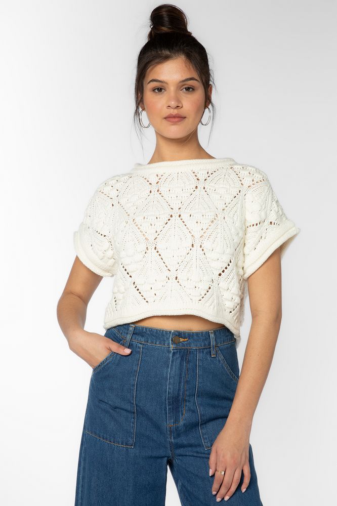 Fashion-forward and fun, the Darlita Sweater will keep you on trend with its textured slouchy knit design, short dolman sleeves, and cropped style.