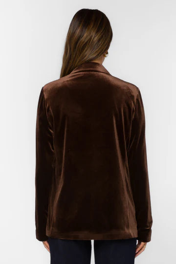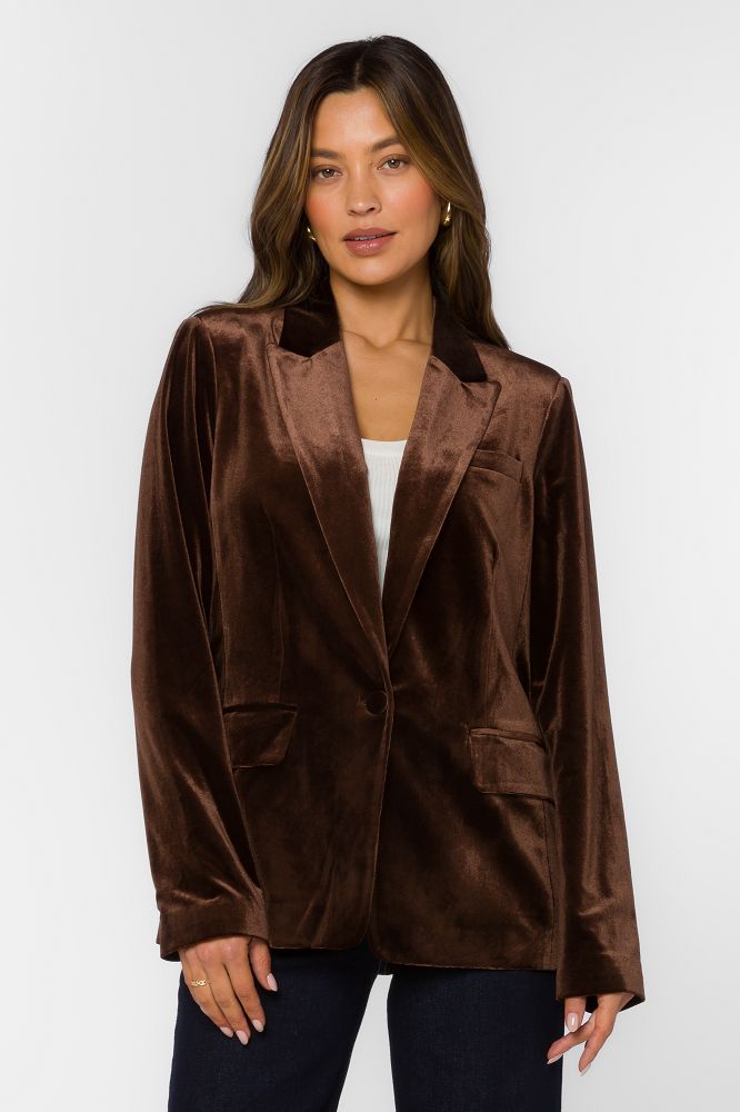 This long sleeve blazer features a sleek lapel, tailored flap pockets, and button closure, crafted from a medium weight fabric with slight stretch, and soft velvet texture.
