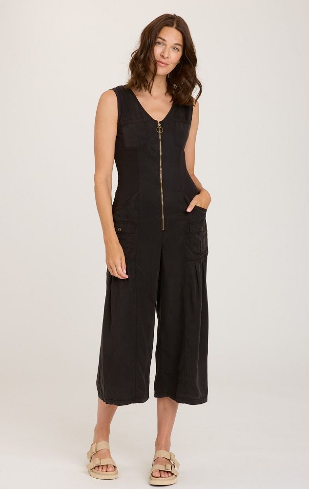 This Soft Twill head-turner features contrasting inserts at the bodice for a fit you can count on, along with mini breast pockets and generous layered pockets at the hips, from which small, box pleats cascade and add soft volume to the leg. A v-neckline descends into an antique brass zipper that makes Macgowan easy to take on and off.