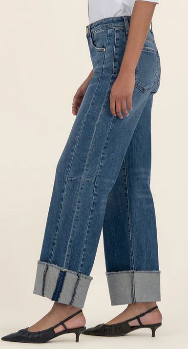 - Relaxed-fit jeans cut from a hint of stretch denim and styled with wide cuffed hems to enhance the laid-back look with our Fab Ab front pockets that smooth and add comfort.