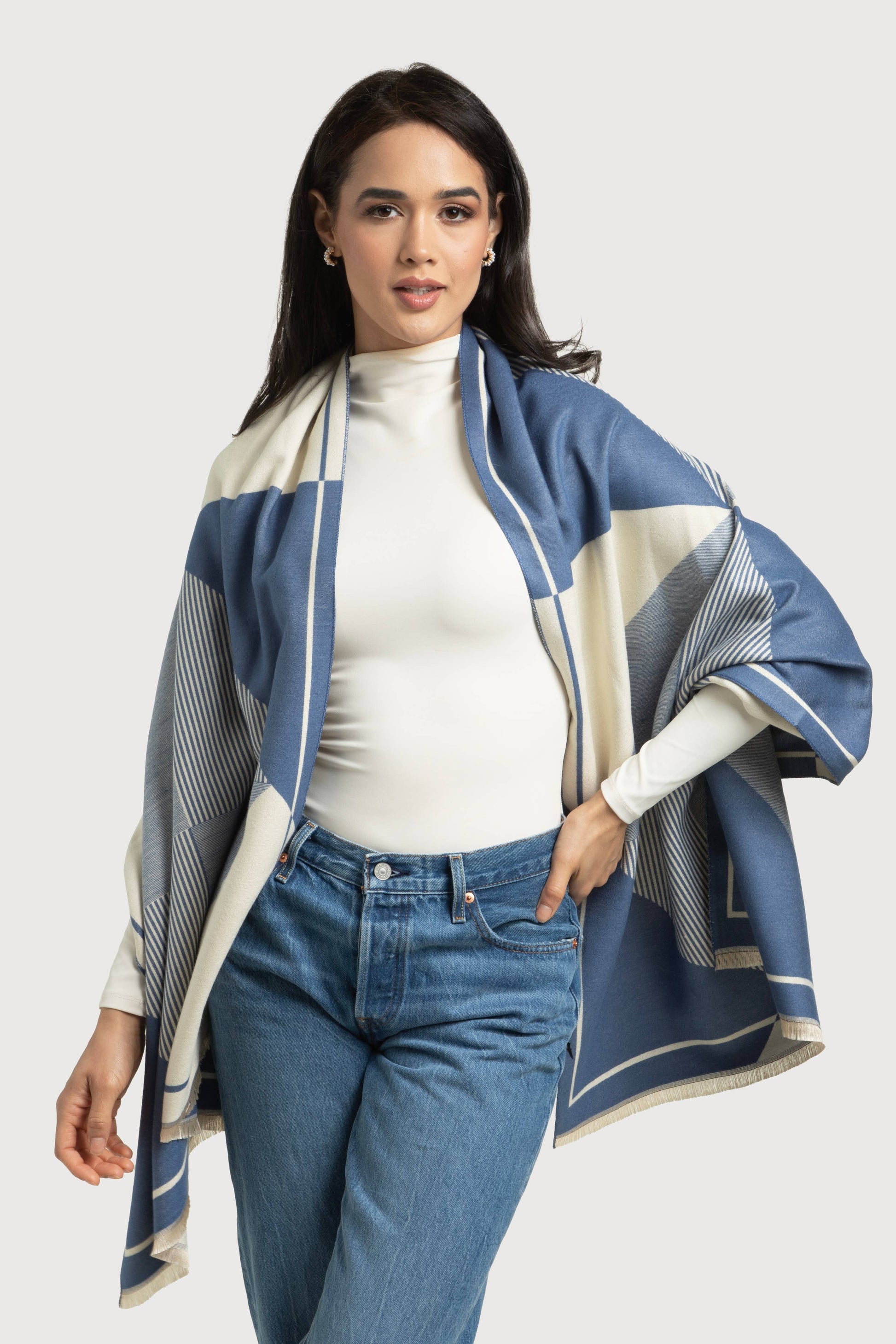 Elevate your look with our Geometric Striped Reversible Scarf. This scarf features a unique design and is made of high-quality viscose, providing a luxurious feel that will keep you comfortable all day. You can wear it on either side, allowing you to switch up your look to match your mood or style.