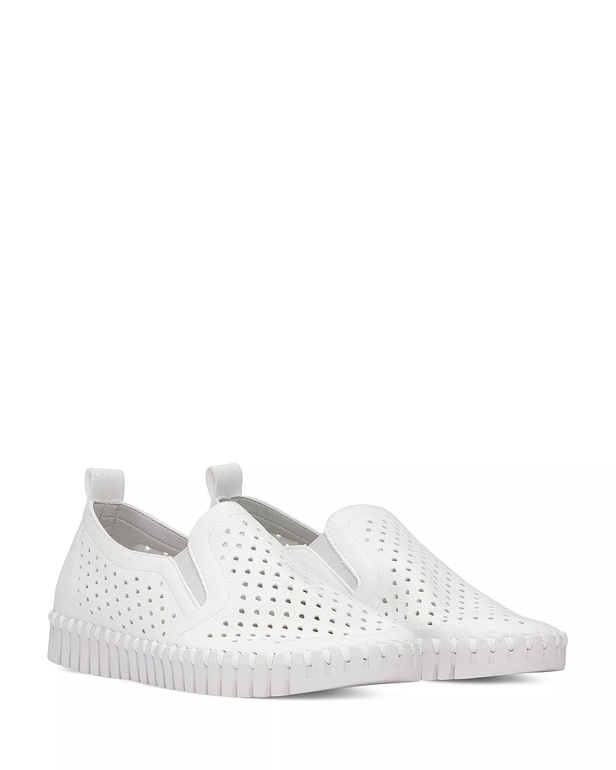 Scalloped embossing frames allover teardrop perforations on the upper of a supercomfortable slip-on sneaker that's whipstitched to a flexible rubber sole.